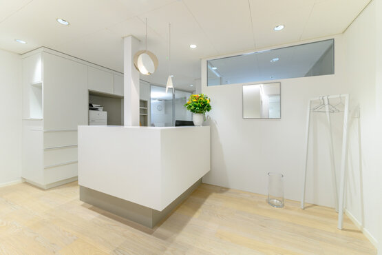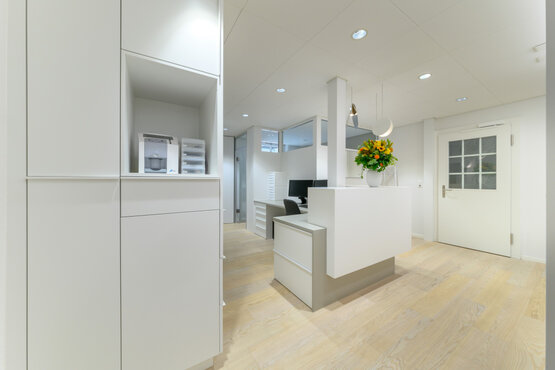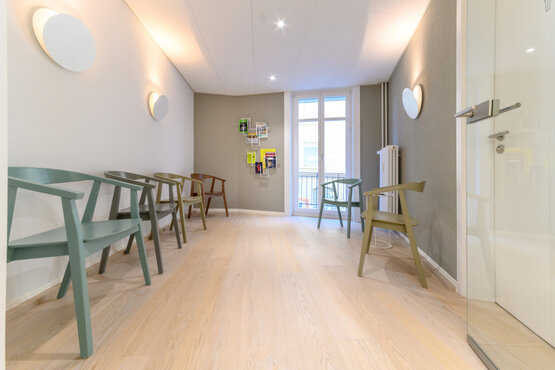 Vor dem Umbau trafen wir einen grossen Raum im Stil der Endsechziger Jahre mit einem gebogenen Empfang und Backoffice an. Einen Warteraum, der zusätzlich mit einem Lager- und Putzschrank bestückt war. Eine abgehängte Tannentäfer Decke schmückte die Decke. Mit dem eleganten vorgesetzten Empfangstresen zeigen wir heute dem Patienten, wo er sich anmelden muss. Durch den durchgehenden Bodenbelag mittels Eichenparkett erhalten wir eine Durchgängigkeit im Boden und verbinden so die Räume zu einem Ganzen. Mit dem neuen zeitgemässen LED-Licht bringen wir, neben dem guten Licht, ein zusätzliches Gestaltungselement. Die grösste Herausforderung war, dass wir nur fünf Wochen Umbauzeit erhielten, was in einem solchen Projekt unrealistisch ist.  Dank des Einsatzes aller beteiligten Unternehmen und den Schlussspurt über die Weihnachtstage konnten wir es trotzdem realisieren und mit sechs wochen Umbauzeit pünktlich eröffnen.