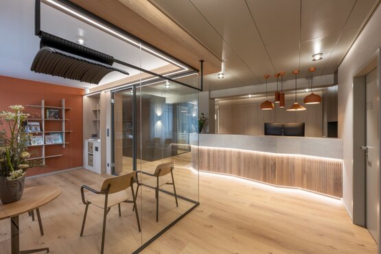 Im zweiten Obergeschoss eines bestehenden Geschäftshauses in Aarau entstand eine neue Zahnarztpraxis, deren Gestaltung die Balance zwischen Funktionalität und einem einladenden Ambiente sucht.