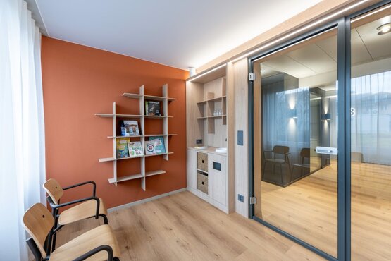 In den Behandlungsräumen stehen Funktionalität und Ästhetik gleichermassen im Fokus. Speziell gestaltete Tapeten und Deckenfelder setzen Akzente und schaffen eine visuelle Abwechslung, die das Wohlbefinden der Patienten unterstützt. Grosse Fenster lassen viel Tageslicht in die Räume und bieten einen Blick auf die Stadt Aarau, während akustische Massnahmen für eine ruhige Umgebung sorgen und die notwendige Privatsphäre garantieren.