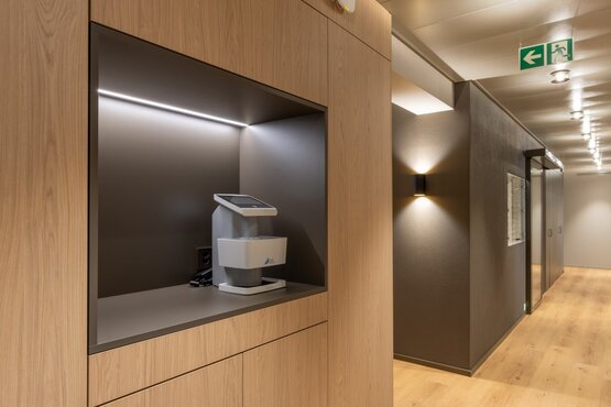 Eine detaillierte Analyse der Räumlichkeiten bildete die Grundlage für den Entwurf. Ziel war es, eine Umgebung zu gestalten, die fortschrittliche Technologie mit einem beruhigenden Gestaltungskonzept vereint. Die Farbgebung der Wände und Decken orientiert sich an sanften, erdigen Tönen – Juragrau und Lavagrau dominieren das Erscheinungsbild und korrespondieren harmonisch mit dem warmen Eichenboden. Diese Material- und Farbwahl trägt dazu bei, eine entspannte Atmosphäre zu erzeugen, die dem oft mit Stress behafteten Zahnarztbesuch entgegenwirkt. Der Empfangsbereich empfängt die Patienten mit warmem Holz und einer zurückhaltenden Beleuchtung, die gezielt eingesetzt wird, um Geborgenheit zu vermitteln. Im angrenzenden Wartebereich sorgen komfortable Sitzgelegenheiten für eine angenehme Aufenthaltsqualität und eine entspannte Wartezeit.