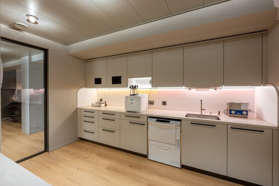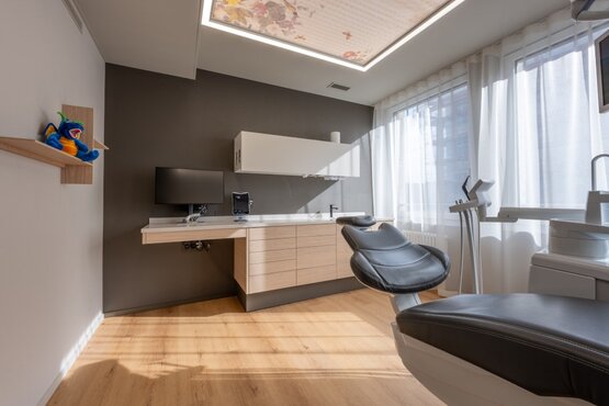 Die technische Ausstattung der Räume entspricht dem neuesten Stand der Zahnmedizin und ermöglicht eine optimale Behandlung. Ein besonderer Gestaltungswunsch der Auftraggeberin war, dass weder Wände noch Decken in klassischem Weiss gehalten werden. Dies führte zu einer konsequent durchdachten Material- und Farbwahl, die die Praxis unverwechselbar macht und ihr eine eigenständige, moderne Identität verleiht. Trotz der architektonischen Vorgaben des Bestandsgebäudes gelang es uns, einen Raum zu schaffen, der höchste funktionale Anforderungen erfüllt und zugleich eine Atmosphäre der Ruhe und Behaglichkeit ausstrahlt.